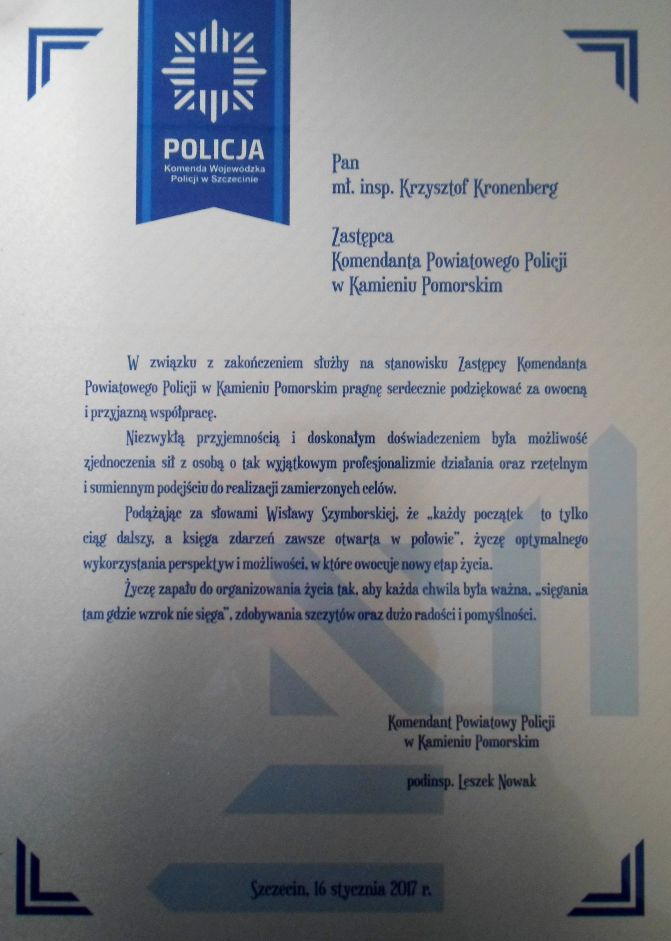 Dzisiaj tj. 16 stycznia 2017 roku mł. insp. Krzysztof Kronenberg, I Zastępca Komendanta Powiatowego Policji w Kamieniu Pomorskim po prawie 26 latach służby odchodzi na emeryturę. Podczas uroczystego spotkania pożegnany został przez p.o. Komendanta Powiatowego Policji podinsp. Leszka Nowaka, funkcjonariuszy oraz pracowników cywilnych komendy.